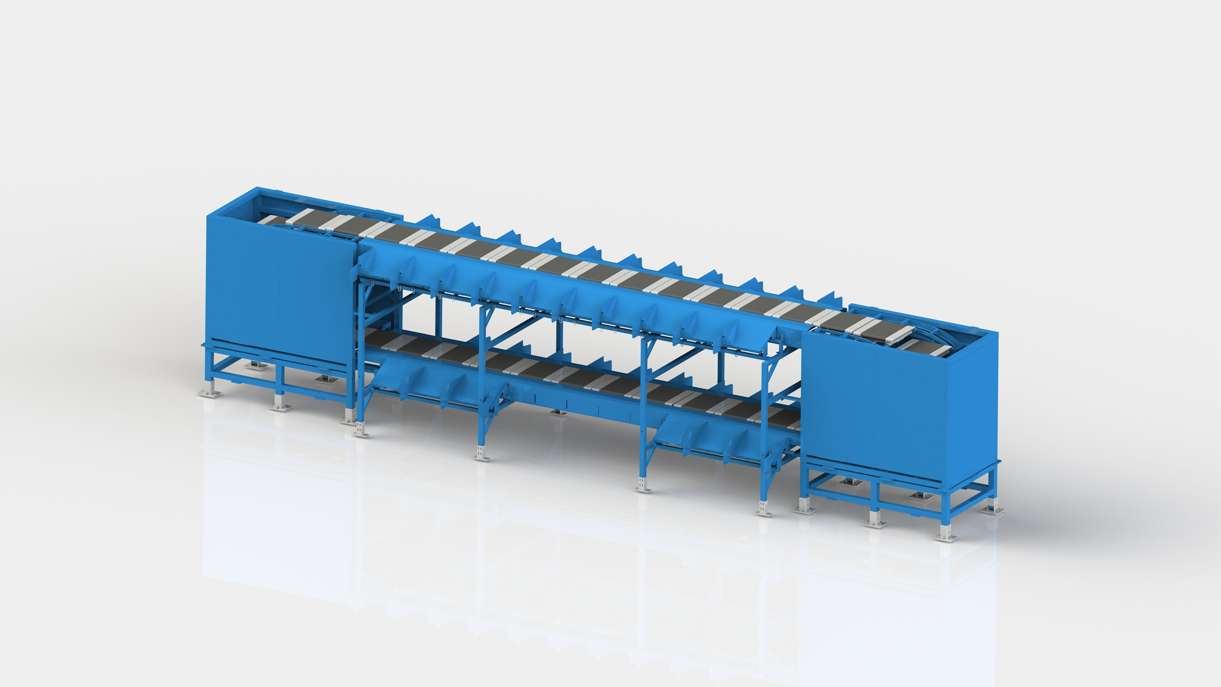 采用双层直线型设计,支持在线补码功能,分拣小车在垂直方向上平移循环运动,空间利用率高,在面积相同情况下,分拣格口数量相比传统直线交叉带分拣机增加一倍。